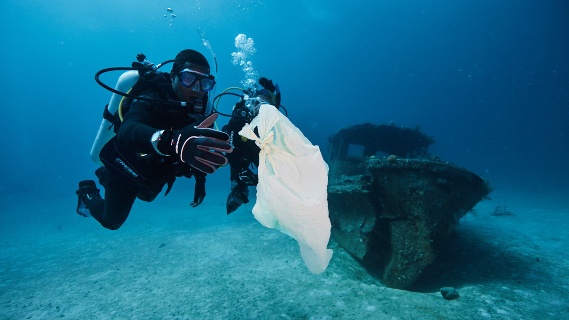 “They need to be comfortable when working in a team underwater, because we’re down there working,” he says. Each team of divers—two scuba, one freediving near the surface—follows GPS coordinates. The scuba divers take mesh bags to pick up small trash along the way and use custom hand signals with the freedivers if they stumble upon something heavy that requires a weighted rope system.